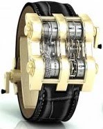 Why It’s Hot: First of all, time is shown in a linear way. Secondly, two parallel chains of more than 30 baguette diamonds rotate past the lines of hours and minutes. And 6 garnets are strewn throughout the diamond chains so you can see what time it is by the placement of the garnets. Even hotter? Only 100 of these time pieces were made.