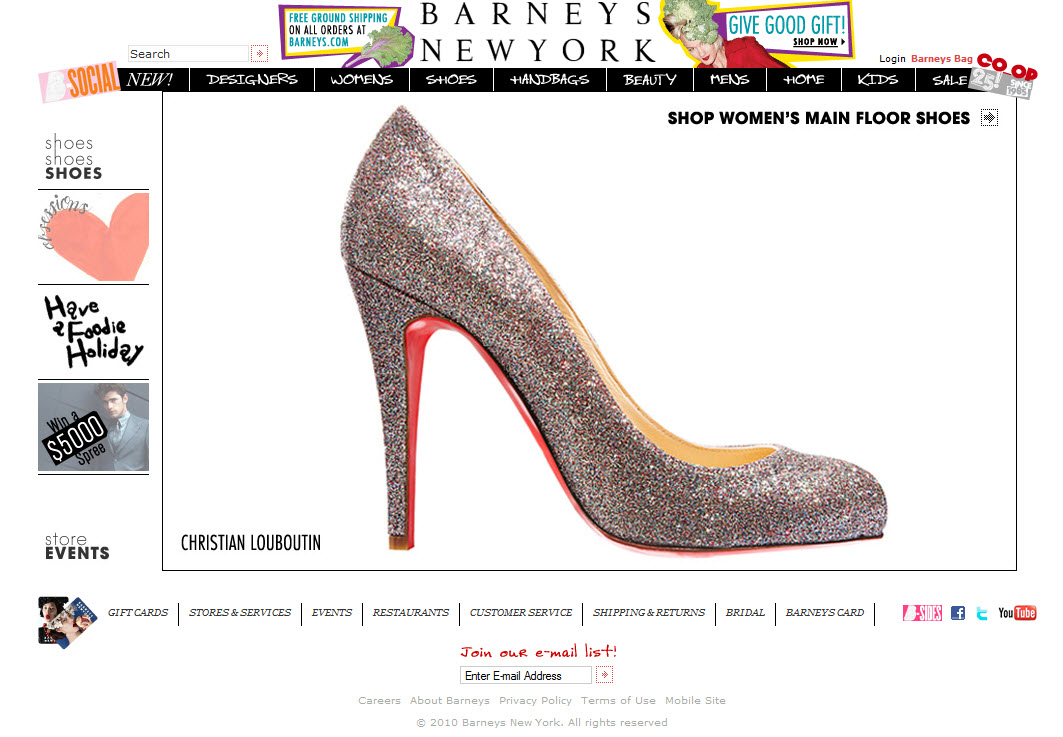 Marc Jacobs: This page is very welcoming. Two of the windows show fashion show videos and an employee comes out of the storefront to greet you. I like the additions of Christmas trees and snow to the usual storefront website design that was launched in September. More on the new website design here.