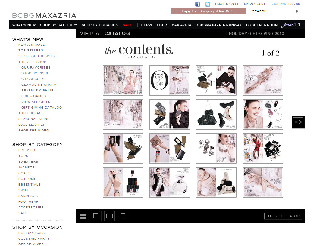 BCBG Max Azria: Though the page took a few moments to load, at least the wait was pleasant. Instead of the usual timer, time ticked by as presents stacked in a pile until a holiday gift catalog appeared. *(Note to friends and family: just about everything shown is on this year’s wish list).