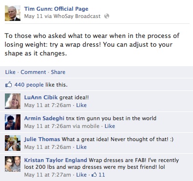 To create this online forum across multiple sites, Tim (and most likely a team) added the WhoSay App- part of the WhoSay site, exclusive to celebrities- to the Tim Gunn Facebook page. Response volume was split pretty evenly between the audience of each medium, but in the future it may be easier for Tim to dedicate time to one medium or the other so as not to confuse people as to how they can interact with him best.