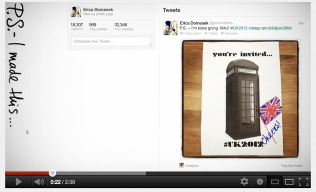 The video is spot on with, let’s face it, how we all act these days. One person hears some news and tweets. Within the matter of seconds, minutes and hours, the buzz grows exponentially larger through retweets and replies. In this case, the video shows Erica Domesek of P.S.- I Made This opening an invitation (shouldn’t the invitation have gone out via Paperless Post?) to the DKNY store re-opening. She scrawls a Union Jack on the invite and takes an Instagram photo, which she then promptly posts on Twitter. From there, others start retweeting and replying to her tweet, and soon, the entire world is making comments across the social web about the re-opening event.