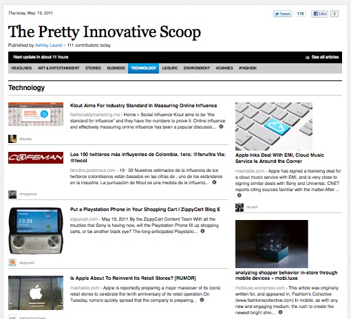 Paper.li (The Pretty Innovative Scoop): Paper.li lets Twitter users turn their newspapers into digital newspapers. While my paper, The Pretty Innovative Scoop, shows content that select people in the fashion and tech scene tweet, there are a growing number of fashion related digital papers, like the popular The Fashion-Tweets Daily.